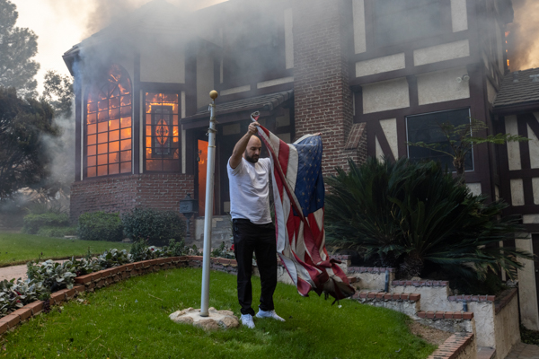 | A man tries to save an American flag during the Eaton Fire in Altadena on Jan. 8, 2025. Photo: Bloomberg/Jill Connelly. |
