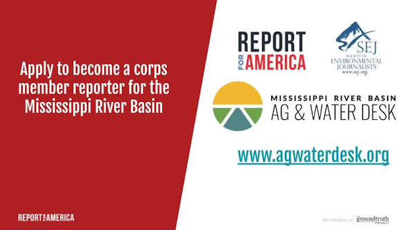 Attend this webinar to learn about Report for America and how to apply for more than 50 full-time reporter positions, including 11 environmental positions offered through a partnership with the University of Missouri School of Journalism and the Society of Environmental Journalists. These 11 positions are part of the Mississippi River Basin Ag & Water Desk, a collaborative network meant to boost coverage of environmental and agricultural issues throughout the river basin.