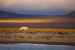 Photo 1 (right): Illuminated by dramatic light at sunset as a storm approaches, a young adult male polar bear (Ursus maritimus) wanders along the ice-free shoreline of Wrangel Island in the Russian High Arctic at the edge of the East Siberian Sea (Arctic Ocean), searching for something to eat. The bear was marooned on land food-deprived, and obliged to subsist on his body fat reserves, because the sea ice necessary for hunting had melted throughout the region and receded far to the north as the result of climate change. Polar bears are obligate carnivores and a blubber-rich diet of marine mammals is essential for their survival, but they can't catch their quick-swimming prey without utilizing a sea-ice platform in some manner. When polar bears are stranded ashore and unable to hunt seals, their primary prey, they occasionally snack on birds' eggs, kelp and other plants, and even human garbage in some locations. Such alternative foods may temporarily fill an empty belly, but they don't provide sufficient nourishment to sustain a polar bear for an extended period of time. In the past, the ice remained near Wrangel Island even in summer, enabling polar bears to hunt seals in the biologically-productive continental shelf region year-round. Now, however, because of rising temperatures, the sea ice recedes toward the very deep waters of the central polar basin in summer and may not return to coastal areas until late autumn or even early winter. Therefore, hungry bears may be stranded on Wrangel Island for several months without the ability to hunt for seals. The polar bear is listed as a Threatened species under the U.S. Endangered Species Act, and is designated as a Vulnerable species on the IUCN Red List. The species is imperiled primarily due to loss of its sea-ice habitat. If current temperature and sea-ice trends continue, scientists anticipate that two-thirds of the world's polar bears will disappear by 2050, and the species could be extinct in the wild by the end of the century.