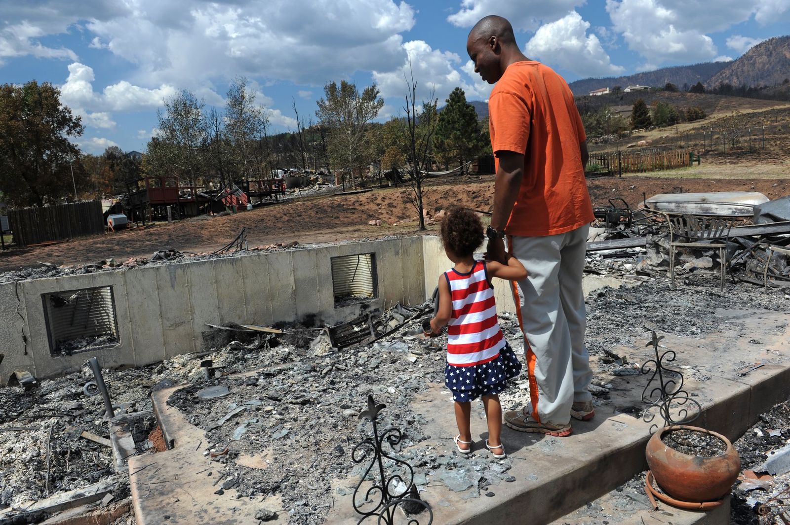 | Immanuel Mgana (above), a U.S. Army soldier deployed in eastern Africa, saw Richardson’s image and recognized that one of the homes burning was his own (shown in the 7:12 p.m. photo, above right. Mgana's home is at the bottom, center, with car in driveway). He was immediately granted leave to return home to his wife and three children. Five days after the Waldo Canyon Fire ravaged their neighborhood, residents were allowed back in to see if their homes were lost or still standing. Over 340 homes were lost in this subdivision, while others, sometimes next door, were left untouched. Here, on July 1, Mgana holds the hand of his daughter Grace, 2, as they survey what is left of their home. It was a total loss. Photo by Helen H. Richardson, The Denver Post. Click to enlarge. |