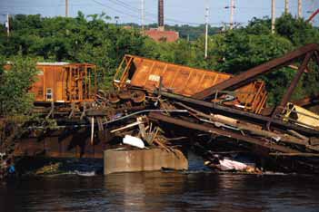 Collapse of the Cedar Rapids and Iowa City (CRANDIC) railroad bridge during June 2008 flooding on the Cedar River in Cedar Rapids, Iowa. Photo: